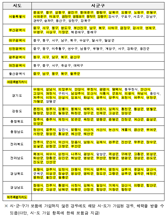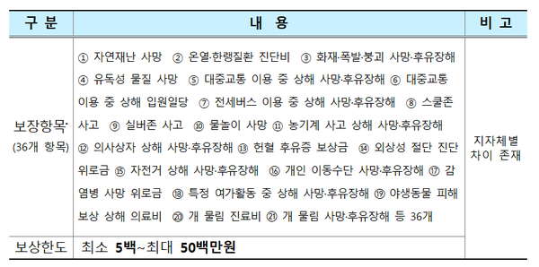 표준 36개 항목 최대 5000만원 까지 보장하지만 지자체별 차이가 있다.