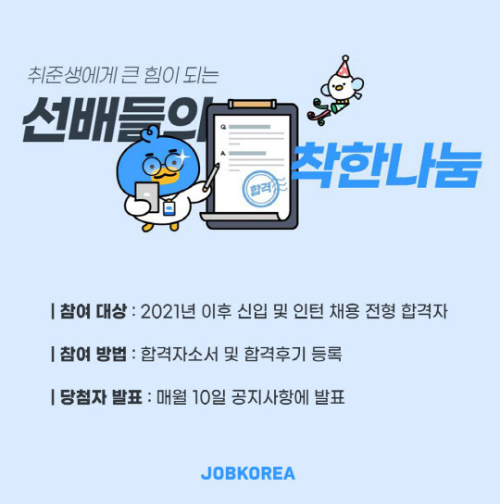 잡코리아는 대기업 합격자들과 취업준비생을 돕는 센배들의 착한나눔